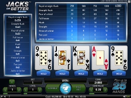 A ce jeu de video poker, vous devez obtenir une main égale ou plus forte que « Jacks or Better », à savoir une paire de Valets ou mieux : une paire de Valets, de Dames, de Rois et d’As. Le tableau des gains se trouve directement sur l’écran, et vous pouvez suivre continuellement les gains que vous pouvez remporter. Après avoir obtenu une combinaison gagnante, vous devez choisir de collecter vos gains ou de passer au jeu bonus.
